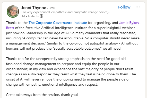 This week I had the privilege of facilitating an Executive AI Institute session for more than 300 directors in the Corporate Governance Institute's global network. AI is no longer a technical side-project: it's the agenda item that keeps leaders refresh-refresh-refreshing their risk dashboards.